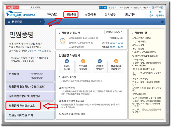 9. 민원처리결과를 보기위해 민원증명 "클릭" 후 민원증명 처리결과 조회 "클릭"