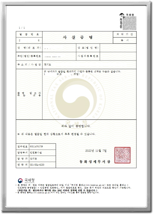 개인회생 보정에 자주 나오는 서류로서 그동안의 사업사실 여부가 있었는지 확인을 하고자 세무서에서 "사실증명"을 발급하셔야 합니다.