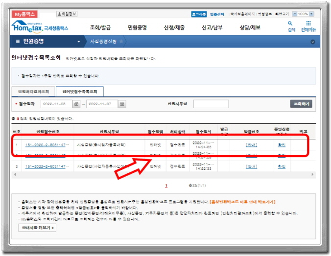 10. 처리상태의 처리완료가 되었다면 발급번호 "클릭" 후 인쇄를 하시면 됩니다.