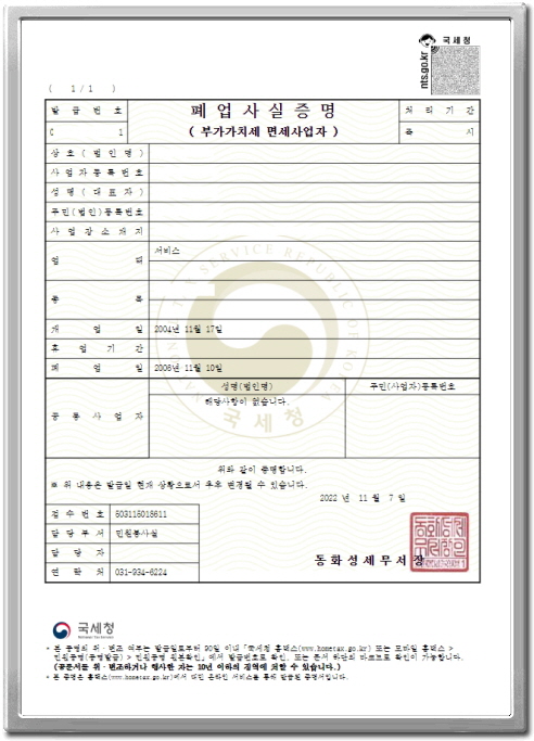 개인회생을 진행하기 전에 사업자를 폐업한 내역이 있다면 폐업증명서를 발급 받으셔야 합니다.